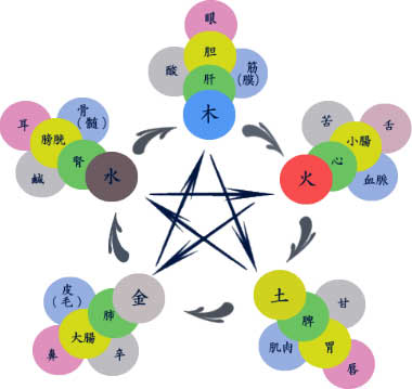 これら5つを属性として、臓腑に対応する性質や病理及び生理・病状を当てはめたのが下記の五行色体表(ごぎょうしきたいひょう)です。